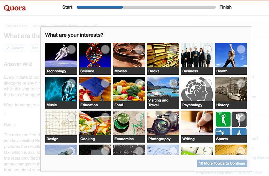 Quora(外國(guó)知乎)為例,注冊(cè)時(shí)會(huì)讓用戶選擇關(guān)鍵詞,會(huì)根據(jù)這個(gè)詞擴(kuò)展出相關(guān)詞匯,這樣用戶進(jìn)入首頁(yè)時(shí),能看到與自己選擇相關(guān)的全部信息,增強(qiáng)對(duì)產(chǎn)品的好感和使用黏度;